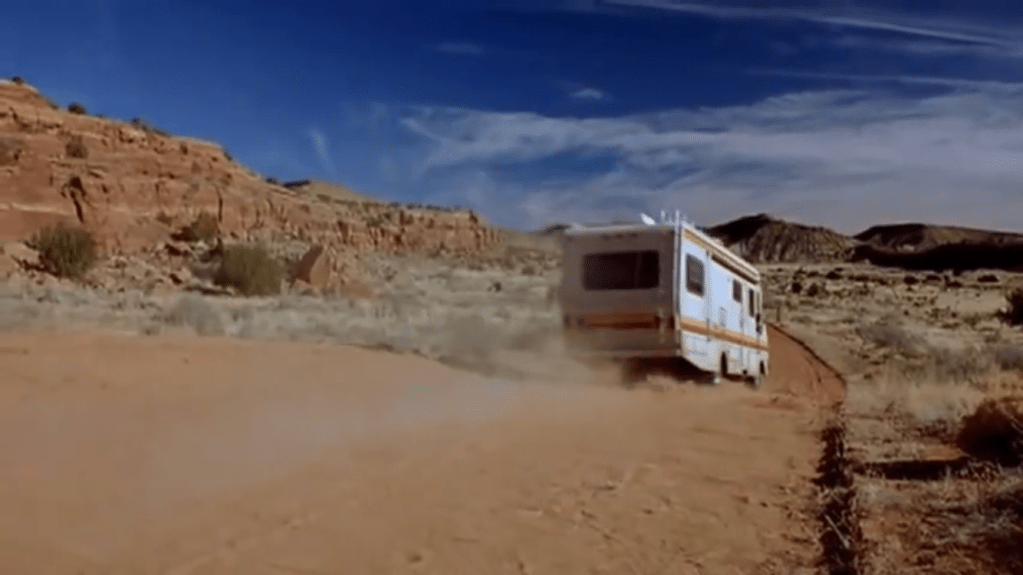 This shot starts of by showing us a fairly quiet desert like area which has a very peaceful tone to start of. That peace is then broken by a speeding camper van. This instantly shows us the chaos happening in this scene and foreshadows the the series as a whole from peace to chaos, from chemistry teacher to drug lord. The camper van can also show us the importance of family throughout the series as at first it is Walter’s, the main character, reason for getting into the meth business.